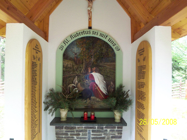 Das Altarbild zeigt den Heiligen Hubertus mit dem Hubertushirsch (Maria Jaritz, Stiwoll). Am oberen runden Bildrand steht “20 Hl. Hubertus sei mit uns 07“. Über dem Bild ist ein Kruzifix. Der Altartisch ist eine Granitplatte auf einer Steinmauer. Die Tafel auf der rechten Seite informiert über die Entstehung, die Tafel auf der linken Seite führt die Namen verstorbener Mitglieder.