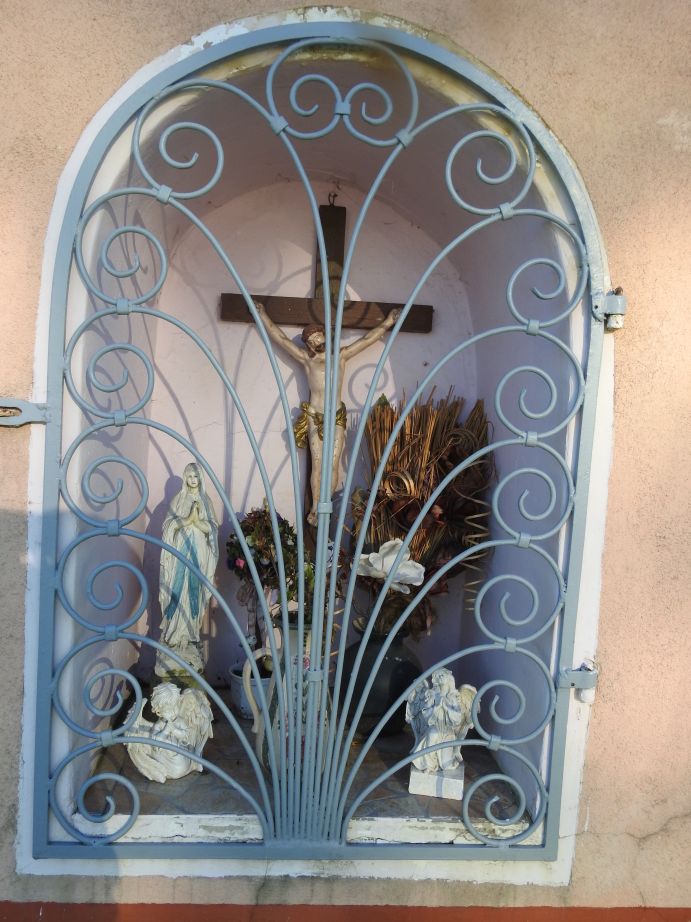 Beschreibung: Es ist ein niedriger gemauerter Bildstock mit Nische, mit schmiedeeisernem Türl. In der Nische ist ein Kruzifix und es ist noch genug Platz für Blumen, Kerzen und fromme Gegenstände. Das Türl ist silber und stellt einen stilisierten Baum dar. Das längliche Spitzdach ist mit Ziegeln gedeckt.